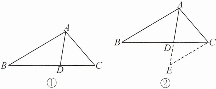 一次数学综合实践活动课上,小慧发现并证明了关于三角形角平分线的一个结论. 如图①,已知$AD$是$\triangle ABC$的角平分线,可证$\frac{AB}{AC}=\frac{BD}{CD}$. 小慧的证明思路如下:如图②,过点$C$作$CE// AB$,交$AD$的延长线于点$E$,构造相似三角形来证明$\frac{AB}{AC}=\frac{BD}{CD}$.