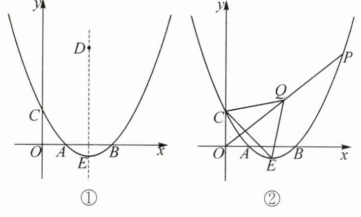 (3) 如图②, $ P $ 是该二次函数图像上的一个动点, 连接 $ O P $, 取 $ O P $ 的中点 $ Q $, 连接 $ Q C $, $ Q E $, $ C E $. 当 $ \triangle C E Q $ 的面积为 12 时, 求点 $ P $ 的坐标.