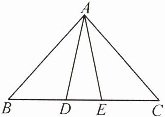 答案:7. A 解析:过点 A 作 AH⊥BC 于点 H,则 ∠AHB=90°. 因为 AB=AC=3,BC=4,所以$ BH=CH=\frac{1}{2}BC=2,$所以$ AH=\sqrt{AB^{2}-BH^{2}}=\sqrt{5}. $因为 D,E 是边 BC 的两个黄金分割点,所以$ BE=CD=\frac{\sqrt{5}-1}{2}BC=2\sqrt{5}-2,$所以$ DE=BE+CD-BC=4\sqrt{5}-8,$所以$ S_{\triangle ADE}=\frac{1}{2}DE· AH=10-4\sqrt{5}. $故 △ADE 的面积为$ 10-4\sqrt{5}.$