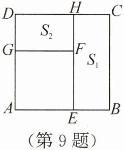 答案:$9. \frac{\sqrt{5}-1}{2} $解析:因为四边形 ABCD 和四边形 AEFG 都为正方形,所以点 G 在 AD 上,且四边形 BCHE 和四边形 DHFG 都为矩形,所以$ S_{1}=BE· BC,S_{2}=DG· GF. $因为 AD=AB,AG=AE,所以 AD-AG=AB-AE,即 DG=BE. 因为 E 是正方形 ABCD 的边 AB 的黄金分割点,且 AE>EB,所以$ \frac{AE}{AB}=\frac{\sqrt{5}-1}{2}. $又 AE=GF,AB=BC,所以$ \frac{S_{2}}{S_{1}}=\frac{DG· GF}{BE· BC}=\frac{AE}{AB}=\frac{\sqrt{5}-1}{2}.$