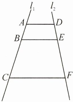 推理能力如图,AD//BE//CF,它们依次交直线$$l _ { 1 }$$,$$l _ { 2 }$$于点A,B,C和点D,E,F,且$$\frac { D E } { E F } = \frac { 2 } { 5 }$$,AC=14.
