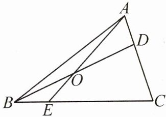 13. 如图,在△ABC中,点D在边AC上,$$\frac { A D } { C D } = \frac { 1 } { 2 }$$,O是BD的中点,连接AO并延长交BC于点E,则$$\frac { B E } { C E } =$$