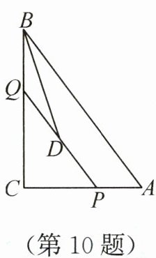 答案:10.B 解析:因为∠C=90°,AB=5,BC=4,所以$AC=\sqrt{AB^{2}-BC^{2}}=3$.因为PQ//AB,所以∠ABD=∠BDQ.因为BD平分∠ABC,所以∠ABD=∠QBD,所以∠QBD=∠BDQ,所以QB=QD.因为D为PQ的中点,所以PQ=2QD=2QB.因为PQ//AB,所以△CPQ∽△CAB,所以$\frac{PC}{AC}=\frac{QC}{BC}=\frac{PQ}{AB}$.设AP=x,QB=y,则PC=AC-AP=3-x,QC=BC-QB=4-y,PQ=2y,所以$\frac{3-x}{3}=\frac{4-y}{4}=\frac{2y}{5}$,解得$x=\frac{15}{13},y=\frac{20}{13}$.故AP的长为$\frac{15}{13}$.