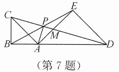 7. 如图,点$A$在线段$BD$上,在$BD$的同侧作等腰直角三角形$ABC$和等腰直角三角形$ADE$($∠ABC=∠AED=90^{\circ }$),$CD$与$BE,AE$分别交于点$P,M$,连接$AP$. 给出下列结论: