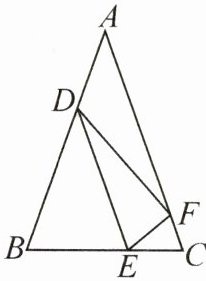 5. 如图,在$\triangle ABC$中,$AB=AC$,点$E$在边$BC$上运动(点$E$不与点$B,C$重合),满足$∠DEF=∠B$,且点$D,F$分别在边$AB,AC$上.