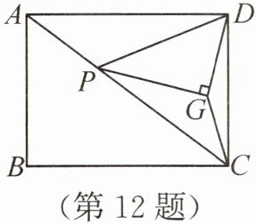 12. 如图,在矩形$ABCD$中,$AB=3$,$BC=4$,$P$是对角线$AC$上的动点,连接$DP$,将直线$DP$绕点$P$顺时针旋转,使$∠DPG=∠DAC$,且$DG⊥PG$,连接$CG$,则$CG$长的最小值为(