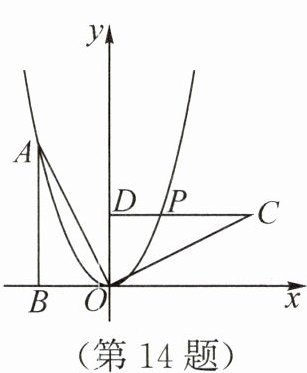 答案:14.C 解析:因为点$A(- 2,4)$在抛物线$y = ax^{2}$上,所以$4 = 4a$,解得$a = 1$,所以$y = x^{2}$.因为点$B$在$x$轴负半轴上,$\angle OBA = 90^{\circ}$,所以$OB = 2$.由旋转的性质,得$OD = OB = 2$,$\angle ODC=\angle OBA = 90^{\circ}$,所以$CD// x$轴,所以点$P$的纵坐标为2.把$y = 2$代入$y = x^{2}$,得$x=\pm\sqrt{2}$.因为点$P$在第一象限,所以点$P$的坐标为$(\sqrt{2},2)$.