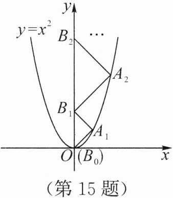15. 亮点原创 如图,在平面直角坐标系中,点 $ B_0 $ 位于原点 $ O $,点 $ A_1 $,$ A_2 $,$ A_3 $,$ ··· $,$ A_n $ 在抛物线 $ y = x^2 $ 上,点 $ B_1 $,$ B_2 $,$ B_3 $,$ ··· $,$ B_n $ 在 $ y $ 轴上. 若 $ \triangle A_1B_0B_1 $,$ \triangle A_2B_1B_2 $,$ ··· $,$ \triangle A_nB_{n - 1}B_n $ 都为等腰直角三角形,则 $ \triangle A_{2025}B_{2024}B_{2025} $ 的腰长为