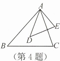 答案:4.$40^{\circ}$解析:因为$\frac{AB}{AD}=\frac{BC}{DE}=\frac{AC}{AE}$,所以$\triangle ABC∼\triangle ADE$,所以$\angle BAC=\angle DAE=60^{\circ}$。因为$\angle BAD=20^{\circ}$,所以$\angle DAC=\angle BAC - \angle BAD = 40^{\circ}$。