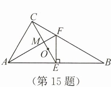 答案:15.D 解析:因为$\angle ACB = 90^{\circ}$,$O$是$\triangle ABC$的重心,所以$OC = \frac{2}{3}CE$,$CE = BE = AE = \frac{1}{2}AB$.因为$EF ⊥ AB$,所以$EF$垂直平分$AB$,所以$AF = BF$.因为$\angle B = 30^{\circ}$,所以$\angle FAE = \angle B = 30^{\circ}$,$\angle BAC = 90^{\circ} - \angle B = 60^{\circ}$,所以$\triangle ACE$为等边三角形,$\angle FAE = \frac{1}{2}\angle BAC$,所以$\angle AEC = 60^{\circ}$,$AM$垂直平分$CE$,所以$CM = \frac{1}{2}CE$,所以$MO = OC - CM = \frac{1}{6}CE$.设等边三角形$ACE$的边长为$a$,则$AE = CE = a$,所以$MO = \frac{1}{6}a$.因为$\angle AEF = 90^{\circ}$,$\angle FAE = 30^{\circ}$,所以$AF = 2EF$,所以$AE = \sqrt{AF^{2}-EF^{2}}=\sqrt{3}EF$,所以$EF = \frac{\sqrt{3}}{3}AE = \frac{\sqrt{3}}{3}a$.因为$\angle EMF = 90^{\circ}$,$\angle FEM = \angle AEF - \angle AEC = 30^{\circ}$,所以$MF = \frac{1}{2}EF = \frac{\sqrt{3}}{6}a$,所以$\frac{MO}{MF}=\frac{\sqrt{3}}{3}$.