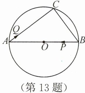 13. 如图,$AB$是$\odot O$的直径,弦$BC=6\ \mathrm{cm}$,$AC=8\ \mathrm{cm}$.若点$P$以$2\ \mathrm{cm/s}$的速度从点$B$出发沿着$B\to A$的方向运动,同时点$Q$以$1\ \mathrm{cm/s}$的速度从点$A$出发沿着$A\to C$的方向运动,当点$P$到达点$A$时,点$Q$也随之停止运动.设运动的时间为$t(t>0)\mathrm{s}$,则当$\triangle APQ$是直角三角形时,$t$的值为