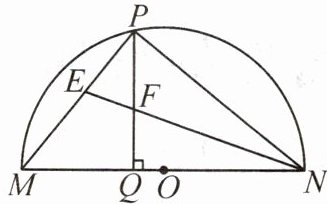 答案:10.D 解析:因为$MN$为半圆$O$的直径,所以$\angle MPN = 90^{\circ}$.因为$PQ ⊥ MN$,所以$\angle MQP = \angle PQN = 90^{\circ}$,所以$\angle PQN = \angle MPN$.因为$NE$平分$\angle MNP$,所以$\angle PNE = \angle QNF$,所以$\triangle PEN ∼ \triangle QFN$,所以$\frac{PE}{QF}=\frac{NP}{NQ}$.因为$\angle PNQ + \angle NPQ = \angle PNQ + \angle PMQ$,所以$\angle NPQ = \angle PMQ$.又$\angle PQN = \angle MQP$,所以$\triangle NPQ ∼ \triangle PMQ$,所以$\frac{NP}{PM}=\frac{NQ}{PQ}$,即$\frac{NP}{NQ}=\frac{PM}{PQ}$,所以$\frac{PE}{QF}=\frac{PM}{PQ}$,所以$\frac{PE}{PM}=\frac{QF}{PQ}$,所以$\frac{PE}{PM}=\frac{PQ - PF}{PQ}=1 - \frac{PF}{PQ}$,所以$\frac{PF}{PQ}+\frac{PE}{PM}=1$.
