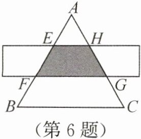 答案:6. $\frac{1}{3}$ 解析:由题意,得EH//FG//BC,所以△AEH∽△AFG∽△ABC.因为AE=EF=BF,所以$\frac{AF}{AB}=\frac{2}{3}$,$\frac{AE}{AB}=\frac{1}{3}$,所以$\frac{S_{△AFG}}{S_{△ABC}}=(\frac{AF}{AB})^2=\frac{4}{9}$,$S_{△AEH}=(\frac{AE}{AB})^2=\frac{1}{9}$,所以S_△AFG=$\frac{4}{9}$S_△ABC,S_△AEH=$\frac{1}{9}$S_△ABC,所以S_阴影=S_△AFG - S_△AEH=$\frac{1}{3}$S_△ABC.故阴影部分的面积是△ABC面积的$\frac{1}{3}$.