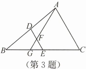 答案:3. C 解析:过点D作DH//BC,交AG于点H,则∠FDH=∠FEG,∠FHD=∠FGE.因为F是DE的中点,所以DF=EF.在△DFH和△EFG中,$\begin{cases} ∠FHD=∠FGE,\\ ∠FDH=∠FEG,\\ DF=EF,\end{cases}$所以△DFH≌△EFG,所以FH=FG,S_△DFH=S_△EFG=1.因为DE是△ABC的中位线,所以D是AB的中点,所以AD=BD=$\frac{1}{2}$AB.因为DH//BC,所以△ADH∽△ABG,$\frac{AH}{HG}=\frac{AD}{BD}=1$,所以AH=HG=FH+FG=2FH,所以S_△ADH=2S_△DFH=2.因为$\frac{S_{△ADH}}{S_{△ABG}}=(\frac{AD}{AB})^2=\frac{1}{4}$,所以S_△ABG=8,所以S_四边形BDHG=S_△ABG - S_△ADH=6,所以S_△DBE=S_四边形BDFG+S_△EFG=S_四边形BDFG+S_△DFH=S_四边形BDHG=6.因为DE是△ABC的中位线,所以DE//AC,所以△DBE∽△ABC,所以$\frac{S_{△DBE}}{S_{△ABC}}=(\frac{DB}{AB})^2=\frac{1}{4}$,所以S_△ABC=24.故△ABC的面积为24.