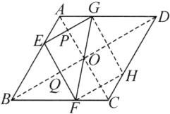 答案:16. 27 解析:如图,在边CD上取点H,使CH=$\frac{1}{3}$CD,连接FH,GH,AC,BD,AC与BD相交于点O,EG交AC于点P,FE交BD于点Q,则由对称性可知四边形EFHG是平行四边形,且EG//BD//FH,EF//AC//GH,点O在FG上,S_四边形OPEQ=2S_△OPG=2S_△OFQ.因为S_△EFG=6,所以S_△OPG=S_△OFQ=$\frac{3}{2}$,S_四边形OPEQ=3.因为EG//BD,所以△AEP∽△ABO.设S_△AEP=x.因为$(\frac{AE}{AB})^2=(\frac{1}{3})^2=\frac{1}{9}$,所以S_△ABO=9x.因为EF//AC,所以△EBQ∽△ABO,所以$\frac{S_{△EBQ}}{S_{△ABO}}=(\frac{EB}{AB})^2=\frac{4}{9}$,所以S_△EBQ=4x,所以S_四边形OPEQ=S_△ABO - S_△EBQ - S_△AEP=4x,所以4x=3,解得x=$\frac{3}{4}$,所以S_△ABO=$\frac{27}{4}$,所以S_菱形ABCD=4S_△ABO=27.