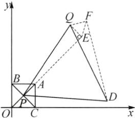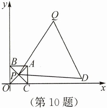 10. 亮点原创 如图,在平面直角坐标系中,$O$是原点,点$Q$的坐标为$(5,7)$,正方形$OCAB$的边$OB$,$OC$分别在$y$轴、$x$轴的正半轴上,点$A$的坐标为$(2,2)$,$OA$,$BC$交于点$P$,连接$PQ$.以点$O$为位似中心,将正方形$OCAB$在第一象限内放大,点$P$随正方形一起运动,当$PQ$的长取最小值时停止运动.以$PQ$为一边,向$PQ$的右侧作等边三角形$PQD$,则在这个位似变化过程中,点$D$运动的路径长是(