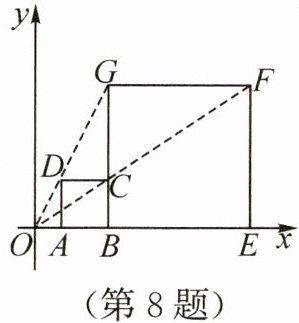 8. 如图,在平面直角坐标系中,正方形$ABCD$与正方形$BEFG$是以原点$O$为位似中心的位似图形,且相似比为$1:3$,点$A$,$B$,$E$在$x$轴上.若正方形$BEFG$的边长为$6$,则点$C$的坐标为