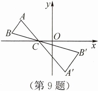 答案:9.-3 解析:如图,过点B作BD⊥x轴于点D,过点B'作B'E⊥x轴于点E,则∠BDC = ∠B'EC = 90°。又∠BCD = ∠B'CE,所以△BCD∽△B'CE,所以$\frac{CD}{CE}=\frac{BC}{B'C}$。因为△ABC与△A'B'C面积的比为4:9,所以$\frac{BC}{B'C}=\frac{2}{3}$。设点B的横坐标是x,则OD = -x。因为点B'的横坐标是2,点C的坐标是(-1,0),所以OE = 2,OC = 1,所以CE = OE + OC = 3,CD = OD - OC = -x - 1,所以$\frac{-x - 1}{3}=\frac{2}{3}$,解得x = -3。故点B的横坐标是-3。