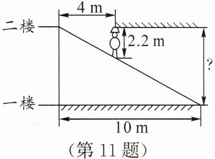 答案:11.A 解析:如图,由题意,得BC//DE,所以△ABC∽△ADE,所以$\frac{BC}{DE}=\frac{AB}{AD}$.设DE=xm.因为BC=2.2m,AB=4m,AD=10m,所以$\frac{2.2}{x}=\frac{4}{10}$,解得x=5.5.经检验,x=5.5是原分式方程的解.故两层楼之间的高约为5.5m.