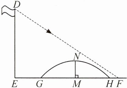 10. 某实验中学数学兴趣小组在周末开展研究性学习,测算小桥所在圆的半径。他们发现 $ 8 \, \mathrm{m} $ 高的旗杆 $ DE $ 的影子 $ EF $ 落在了包含一圆弧形小桥在内的路上(如图),此时,身高 $ 1.6 \, \mathrm{m} $ 的海涛测得自己的影长为 $ 2.4 \, \mathrm{m} $,同时测得 $ EG $ 的长为 $ 3 \, \mathrm{m} $,$ HF $ 的长为 $ 1 \, \mathrm{m} $,测得拱高($\overset{\frown}{GH}$ 的中点 $ N $ 到弦 $ GH $ 的距离,即 $ MN $ 的长)为 $ 2 \, \mathrm{m} $,求小桥所在圆的半径。