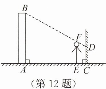 12. 小明想利用太阳光测量楼高。他带着皮尺来到一栋楼下,发现对面墙上有这栋楼的影子,针对这种情况,他设计了一种测量方案,具体测量过程如下:如图,小明边移动边观察,发现站到点 $ E $ 处时,可以使自己落在墙上的影子与这栋楼落在墙上的影子重叠,且高度恰好相等,此时测得小明落在墙上的影子高度 $ CD = 1.2 \, \mathrm{m} $,$ CE = 0.8 \, \mathrm{m} $,$ CA = 30 \, \mathrm{m} $(点 $ A $,$ E $,$ C $ 在同一条直线上)。已知小明的身高 $ EF = 1.7 \, \mathrm{m} $,则楼 $ AB $ 的高度约是