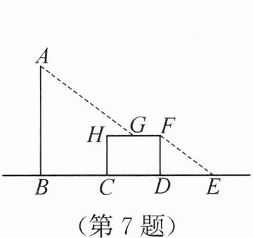 7. 路边有一根竖立的电线杆 $ AB $ 和一块长方形广告牌 $ CDFH $(不考虑广告牌的厚度),有一天小明突然发现在太阳光照射下,电线杆顶端 $ A $ 的影子刚好落在长方形广告牌的边 $ HF $ 的中点 $ G $ 处,而长方形广告牌上点 $ F $ 的影子刚好落在地面上点 $ E $ 处(如图)。已知 $ BC = 5 \, \mathrm{m} $,长方形广告牌的长 $ HF = 4 \, \mathrm{m} $,高 $ HC = 3 \, \mathrm{m} $,$ DE = 4 \, \mathrm{m} $,则电线杆 $ AB $ 的高度是(