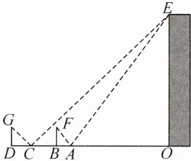 答案:4.设$OE=xm$,$AO=am$,$BC=bm$.因为$AC=2m$,$BD=2.1m$,所以$CD=BD - BC=(2.1 - b)m$,$AB=AC - BC=(2 - b)m$,$CO=AC + AO=(2 + a)m$.由题意,得$\angle DCG=\angle OCE$,$\angle CDG=\angle COE = 90^{\circ}$,$\angle BAF=\angle OAE$,$\angle ABF=\angle AOE = 90^{\circ}$,所以$\triangle DCG ∼ \triangle OCE$,$\triangle BAF ∼ \triangle OAE$,所以$\frac{DG}{OE}=\frac{CD}{CO}$,$\frac{BF}{OE}=\frac{AB}{AO}$.因为$BF=DG=1.6m$,所以$\frac{1.6}{x}=\frac{2.1 - b}{2 + a}$,$\frac{1.6}{x}=\frac{2 - b}{a}$.整理,得$3.2 + 1.6a=2.1x - bx$①,$1.6a=2x - bx$②.由①②,得$3.2 + 2x - bx=2.1x - bx$,解得$x=32$.经检验,$x = 32$符合题意.故楼$OE$的高度为$32m$.
