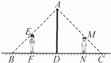 答案:3.4 解析:设$AD=xm$,$DF=ym$,$DN=zm$.由题意,得$EF// AD$,$MN// AD$,所以$\triangle BEF ∼ \triangle BAD$,$\triangle CMN ∼ \triangle CAD$,所以$\frac{EF}{AD}=\frac{BF}{BD}$,$\frac{MN}{AD}=\frac{CN}{CD}$,即$\frac{1.8}{x}=\frac{1.8}{1.8 + y}$,$\frac{1.5}{x}=\frac{1.5}{1.5 + z}$,所以$y=x - 1.8$,$z=x - 1.5$.因为两人相距$4.7m$,所以$y + z=4.7$,所以$x - 1.8 + x - 1.5=4.7$,解得$x=4$.经检验,$x = 4$符合题意.故路灯$AD$的高度是$4m$.