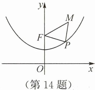 14. (2025·江苏淮安模拟)已知抛物线 $ y = \frac{1}{4}x^{2}+1 $ 具有如下性质:该抛物线上任意一点到定点 $ F(0,2) $ 的距离与到 $ x $ 轴的距离始终相等.如图,若点 $ M $ 的坐标为 $ (\sqrt{3},3) $,$ P $ 是抛物线 $ y = \frac{1}{4}x^{2}+1 $ 上一个动点,则 $ \triangle PMF $ 周长的最小值是