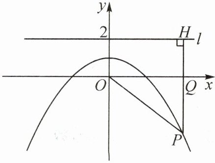 推导探究 如图,$ P(m,n) $ 是抛物线 $ y = -\frac{1}{4}x^{2}+1 $ 上任意一点,$ l $ 是经过点 $ (0,2) $ 且与 $ x $ 轴平行的直线,过点 $ P $ 作 $ PH⊥ l $,垂足为 $ H $,$ PH $ 交 $ x $ 轴于点 $ Q $.