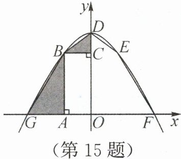 15. 如图,抛物线 $ y = ax^{2}+c(a<0) $ 交 $ x $ 轴于点 $ G $,$ F $,交 $ y $ 轴于点 $ D $,在 $ x $ 轴上方的抛物线上有两点 $ B $,$ E $,它们关于 $ y $ 轴对称,点 $ G $,$ B $ 在 $ y $ 轴的左侧,$ BA⊥ OG $ 于点 $ A $,$ BC⊥ OD $ 于点 $ C $,四边形 $ OABC $ 与四边形 $ ODEF $ 的面积分别为 6 和 10,则 $ \triangle ABG $ 与 $ \triangle BCD $ 的面积之和为