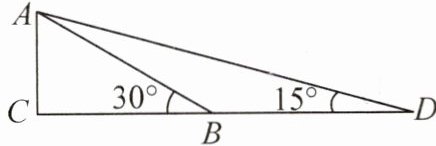 几何直观 构建几何图形解决代数问题是“数形结合”思想的重要应用. 在计算 tan 15°时,如图,在 Rt△ACB 中,∠C = 90°,∠ABC = 30°,延长 CB 至点 D,使 BD = AB,连接 AD,得∠D = 15°,所以 tan 15° = $\frac{AC}{CD}$ = $\frac{1}{2 + \sqrt{3}}$ = $\frac{2 - \sqrt{3}}{(2 + \sqrt{3})×(2 - \sqrt{3})}$ = 2 - $\sqrt{3}$. 类比这种方法,计算 tan 22.5°的值为