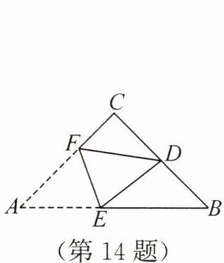 答案:14.B 解析:因为△ABC是等腰直角三角形,∠C = 90°,所以CA = CB,∠A = ∠B = 45°.由折叠的性质,得DF = AF,∠EDF = ∠A = 45°.因为∠CDE = ∠BED + ∠B = ∠CDF + ∠EDF,所以∠BED = ∠CDF.设CD = 1,CF = x.因为D为BC的中点,所以CA = CB = 2CD = 2,所以DF = AF = CA - CF = 2 - x.因为$CF^2 + CD^2 = DF^2$,所以$x^2 + 1^2 = (2 - x)^2$,解得$x = \frac{3}{4}$,所以$CF = \frac{3}{4}$,$DF = \frac{5}{4}$,所以$\sin∠BED = \sin∠CDF = \frac{CF}{DF} = \frac{3}{5}$.