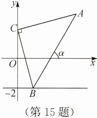 15. 如图,在平面直角坐标系中,$O$是原点,点$A(4,3)$,$B$为直线$y = - 2$上的一动点,点$C(0,n)$,$- 2 < n < 3$,$AC ⊥ BC$,连接$AB$.若直线$AB$与$x$轴正半轴所夹的锐角为$\alpha$,则当$\sin \alpha$的值最大时,$n$的值为