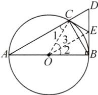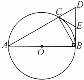 答案:12.(1)如图,连接OC,OE.因为BD⊥AB,所以∠OBE=90°.因为OA=OC,所以∠A=∠1.因为OA=OB,E是BD的中点,所以OE是△ABD的中位线,所以OE//AD,所以∠1=∠3,∠A=∠2,所以∠2=∠3.在△COE和△BOE中,$\begin{cases}OC = OB\\\angle3 = \angle2\\OE = OE\end{cases}$,所以△COE≌△BOE,所以∠OCE=∠OBE=90°,所以OC⊥CE.因为OC 是⊙O的半径,所以CE是⊙O的切线.