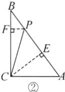 答案:11.26°34'或16°16' 解析:因为∠ACB=90°,AB=5,BC=4,所以AC⊥BC,AC=$\sqrt{AB²−BC²}$=3.分类讨论如下:①如图①,当AP=AC=3时,过点P作PD⊥BC于点D,则PB=AB−AP=2,PD//AC,所以△PBD∽△ABC,所以$\frac{BD}{BC}$=$\frac{PD}{AC}$=$\frac{PB}{AB}$,即$\frac{BD}{4}$=$\frac{PD}{3}$=$\frac{2}{5}$,所以BD=1.6,PD=1.2,所以CD=BC−BD=2.4,所以tan∠BCP=$\frac{PD}{CD}$=$\frac{1}{2}$,所以∠BCP≈26°34';②如图②,当CP=AC=3时,过点C作CE⊥AB 于点E,过点P作PF⊥BC于点F,则AE=PE=$\frac{1}{2}$AP,PF//AC,∠AEC=∠ACB=90°.又∠A=∠A,所以△ACE∽△ABC,所以$\frac{AC}{AB}$=$\frac{AE}{AC}$,即$\frac{3}{5}$=$\frac{AE}{3}$,所以AE=1.8,所以AP=2AE=3.6,所以PB=AB−AP=1.4.因为PF//AC,所以△PBF∽△ABC,所以$\frac{BF}{BC}$=$\frac{PF}{AC}$=$\frac{PB}{AB}$,即$\frac{BF}{4}$=$\frac{PF}{3}$=$\frac{7}{25}$,所以BF=$\frac{28}{25}$,PF=$\frac{21}{25}$,所以CF=BC−BF=$\frac{72}{25}$,所以tan∠BCP=$\frac{PF}{CF}$=$\frac{7}{24}$,所以∠BCP≈16°16'.综上所述,∠BCP的度数约为26°34′或16°16′.