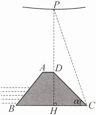 6. 沿江大堤经过改造后的某处横断面为如图所示的梯形ABCD,高$DH = 12$m,斜坡CD的坡度$i = 1:1$. 此处大堤的正上方有高压电线穿过,PD表示高压线上的点与堤面AD的最近距离(点P,D,H在同一条直线上),在点C处测得$∠DCP = 26°$.