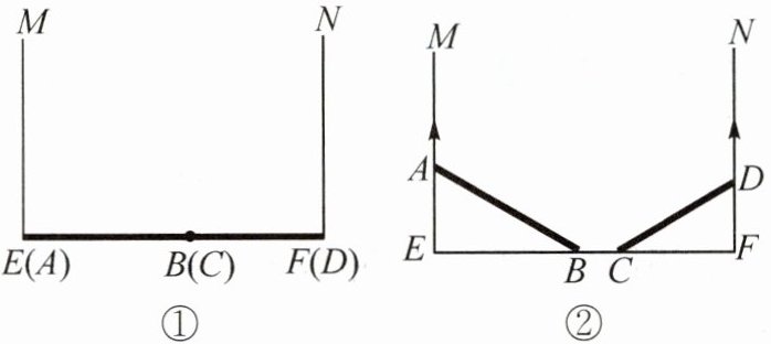 9. (2025·江苏盐城模拟)如图是某公共汽车双开门的俯视示意图,$ME$,$EF$,$FN$ 是门轴的滑动轨道,$\angle E = \angle F = 90^{\circ}$,两门 $AB$,$CD$ 的门轴 $A$,$B$,$C$,$D$ 都在滑动轨道上,两门关闭时(图①),$A$,$D$ 分别在 $E$,$F$ 处,门缝忽略不计(即 $B$,$C$ 重合);两门同时开启(图②),$A$,$D$ 分别沿 $E \to M$,$F \to N$ 的方向匀速滑动,带动 $B$,$C$ 滑动;$B$ 到达 $E$ 时,$C$ 恰好到达 $F$,此时两门完全开启. 已知 $AB = 50$ cm,$CD = 40$ cm.