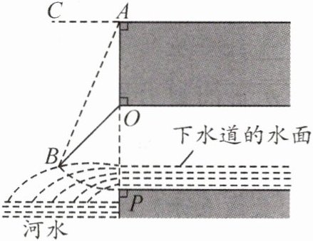 $OP$ 为下水管道口直径,$OB$ 为可绕转轴 $O$ 自由转动的阀门. 平时阀门被管道中排出的水冲开,可排出城市污水;当河水上涨时,阀门会因河水压迫而关闭,以防河水倒灌入城中. 若阀门的直径 $OB = OP = 100$ cm,$OA$ 为检修时阀门开启的位置,且 $OA = OB$.