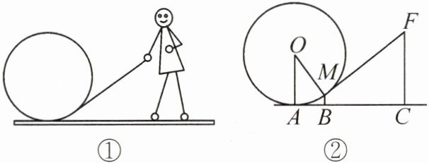 情境素材 如图①是一个小朋友玩“滚铁环”的游戏,铁环是圆形的,铁环向前滚动时,铁环钩保持与铁环相切. 将这个游戏抽象为数学问题,如图②,已知铁环的半径为 25 cm,设铁环的中心为 $O$,铁环钩与铁环的相切点为 $M$,铁环与地面的接触点为 $A$,且 $\sin \angle AOM = \frac{3}{5}$. 若人站立点 $C$ 与点 $A$ 的水平距离 $AC = 55$ cm,则铁环钩 $FM$ 的长为(