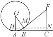 答案:C 解析:如图,过点M作与AC平行的直线,与OA,FC分别相交于点H,N,则∠OHM=∠OAB=90°,∠FNM=∠FCB=90°.因为OM=25cm,sin∠AOM=$\frac{3}{5}$,所以HM=OM·sin∠AOM=15cm,所以OH=$\sqrt{OM²−HM²}$=20cm.因为FM与$\odot O$相切,所以OM⊥FM,所以∠OMF=90°,所以∠OMH+∠FMN=180°−∠OMF=90°.因为∠OMH+∠AOM=90°,所以∠FMN=∠AOM,所以sin∠FMN=sin∠AOM=$\frac{3}{5}$,所以$\frac{FN}{FM}$=$\frac{3}{5}$.设FM=5xcm,则FN=3xcm,所以MN=$\sqrt{FM²−FN²}$=4xcm.因为AC=55cm,所以MN=BC=AC−AB=AC−HM=40cm,所以4x=40,解得x=10,所以FM=50cm.故铁环钩FM的长为50cm.