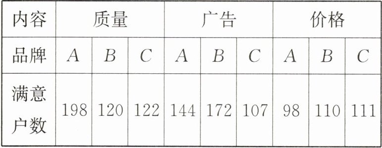 (3) 有影响. 理由如下:B,C两种品牌洗衣粉在质量和价格方面的满意户数比较接近,而在广告方面的满意户数相差较大,且B品牌洗衣粉的市场占有率明显高于C品牌洗衣粉,所以广告对用户选择品牌有影响.