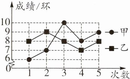 6. 如图是甲、乙两名射击运动员 5 次射击成绩的折线统计图,下列判断正确的是(