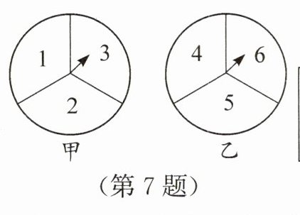 7. 王红和刘芳两人在玩转盘游戏,如图所示,把转盘甲、乙分别分成3等份,并在每一份内标上数字,游戏规则如下:转动两个转盘各一次,转盘停止转动后,若指针所指的两个数字之和为7,则王红获胜;若数字之和为8,则刘芳获胜(指针指向分界线时重转).这二人中获胜可能性较大的是
