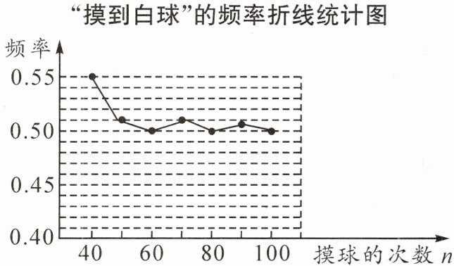 8. 在一个不透明的盒子里装有只有颜色不同的黑、白两种球共100个,小颖做摸球试验,她将盒子里面的球搅匀后从中任意摸出一个球记下颜色,再把它放回盒子中,不断重复上述过程,如图是“摸到白球”的频率折线统计图.