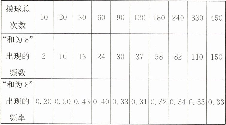 (1) 若试验继续进行下去,根据上表数据,“和为8”出现的频率将稳定在它的概率附近,则估计“和为8”出现的概率是