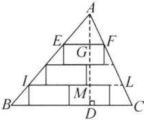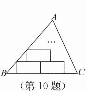 答案:10.B 解析:如图,设最上层的小矩形的上边与$AB$,$AC$分别交于点$E$,$F$,过点$A$作$AD⊥ BC$于点$D$,交$EF$于点$G$.因为$EF// BC$,所以$AG⊥ EF$,$\triangle AEF∼\triangle ABC$,所以$\frac{EF}{BC}=\frac{AG}{AD}$.因为$BC = 12\mathrm{ cm}$,$AD = 9\mathrm{ cm}$,$EF = 4\mathrm{ cm}$,所以$AG = 3\mathrm{ cm}$,所以$GD=AD - AG = 6\mathrm{ cm}$.因为小矩形的宽为$2\mathrm{ cm}$,所以能分割成$6÷2 = 3$(层)小矩形.设与边$BC$距离$2\mathrm{ cm}$的直线与$AB$,$AC$分别交于点$I$,$L$,$IL$与$AD$交于点$M$,则$IL// BC$,所以$AM⊥ IL$,$\triangle AIL∼\triangle ABC$,所以$\frac{IL}{BC}=\frac{AM}{AD}$.因为$MD = 2\mathrm{ cm}$,所以$AM=AD - MD = 7\mathrm{ cm}$,所以$IL=\frac{28}{3}\mathrm{ cm}$.因为$4×2<\frac{28}{3}<4×3$,所以最底层能分割成$2$个小矩形零件.同理可得第二、三层均只能分割成$1$个小矩形零件.故分割成的小矩形零件最多有$2 + 1 + 1 = 4$(个).