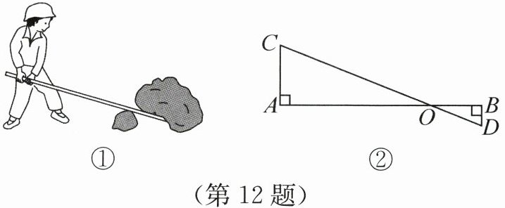 12. (2025·四川内江改编)阿基米德曾说过:“给我一个支点,我能撬动整个地球。”这句话生动体现了杠杆原理:通过调整支点位置和力臂长度,用较小的力就能撬动重物。这一原理在生活中随处可见。如图①,这是用杠杆撬石头的示意图,当用力压杠杆时,另一端就会撬动石头。如图②,若动力臂 $ OA = 150 $ cm,阻力臂 $ OB = 50 $ cm,$ BD = 20 $ cm,则 $ AC $ 的长是