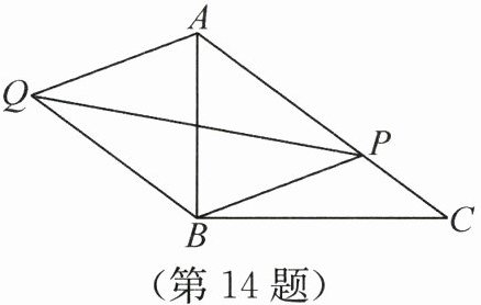 14. (2025·山东临沂)如图,在 $ \mathrm{Rt} \triangle ABC $ 中,$ \angle ABC = 90° $,$ AB = 6 $,$ BC = 8 $,$ P $ 为边 $ AC $ 上异于点 $ A $ 的一点,以 $ PA $,$ PB $ 为邻边作 $ □ PAQB $,则 $ PQ $ 长的最小值是