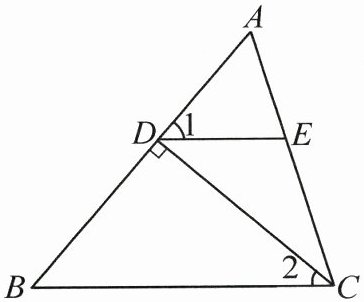 答案:19.(1)因为$CD⊥ AB$,所以$\angle ADC = 90^{\circ}$,所以$\angle1+\angle CDE = 90^{\circ}$.因为$\angle1+\angle2 = 90^{\circ}$,所以$\angle CDE=\angle2$,所以$DE// BC$.